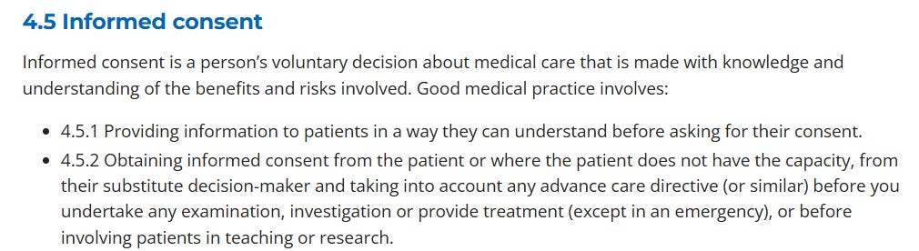 Similarly, the Australian Medical Association also reinforces that informed consent must be freely given, specific, and based on sufficient information for all medical care, including vaccination, adopting guidelines recommended by the Australian Commission on Safety and Quality in Health Care: