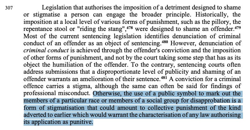 Any stigma that the plaintiff experienced because of wearing the discreet device could be avoided by using a smaller monitoring device like a smart watch, or clothes that would easily cover the device. In any event, the stigma associated with wearing the device was only incidental to the purpose of the device. The purpose of the law matters: it was to monitor compliance; not to shame.25 If, however, “the use of a public symbol to mark out the members of a particular race or members of a social group for disapprobation is a form of stigmatisation [then] that could amount to collective punishment of the kind adverted to earlier which would warrant the characterisation of any law authorising its application as punitive”.26 [emphasis added]