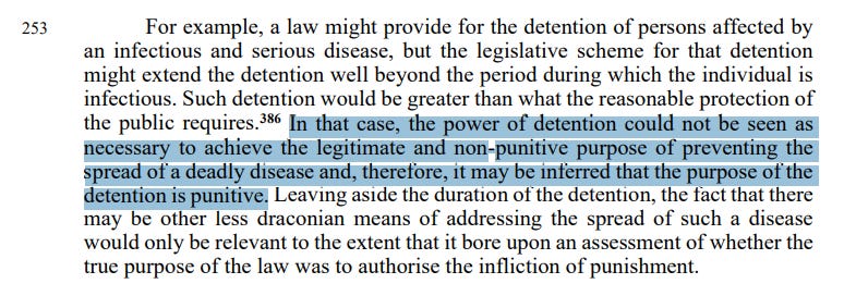 The Commonwealth’s argument was striking for what it inadvertently revealed. By citing pandemic lockdowns as “considerably more onerous” measures that were supposedly non-punitive, it acknowledged the reality of the true nature of lockdowns. After all, how was it that the Commonwealth, wielding significant constitutional power over the States and Territories and during a supposed national crisis, allowed such extreme incursions on liberty to be imposed unchecked?