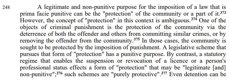 In the event that we accepted that lockdowns were even valid for the “purely protective” purpose of mitigating the spread of an infectious and serious disease, the extension of detention well-beyond the period in which the individual was infectious would be “greater than what the reasonable protection of the public requires”, meaning the measure would be punitive, and therefore, invalid.