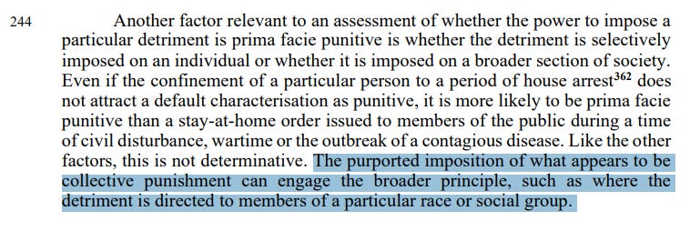 In other words, when a restriction focused on a particular social group, such as the “unvaccinated”, it would be an example of a collective punishment and could be considered punitive rather than protective, therefore, invalidating it.