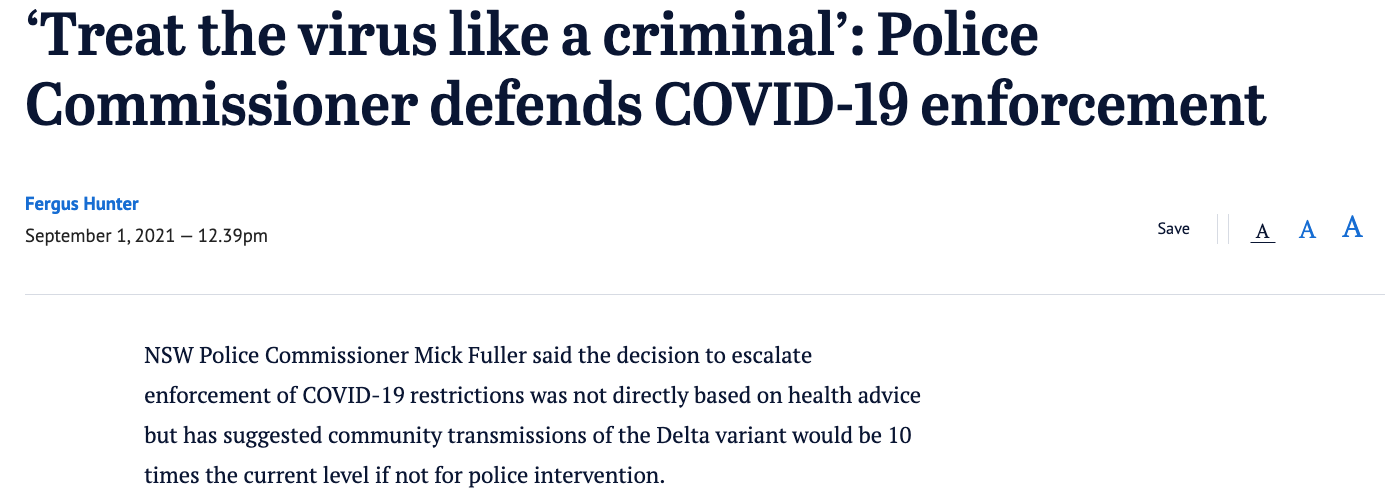 Both measures restricted individual freedoms, often enforced through police patrols, fines, and penalties for non-compliance. The NSW Police Commissioner at the time even suggested treating the virus like a criminal to reduce community transmission: